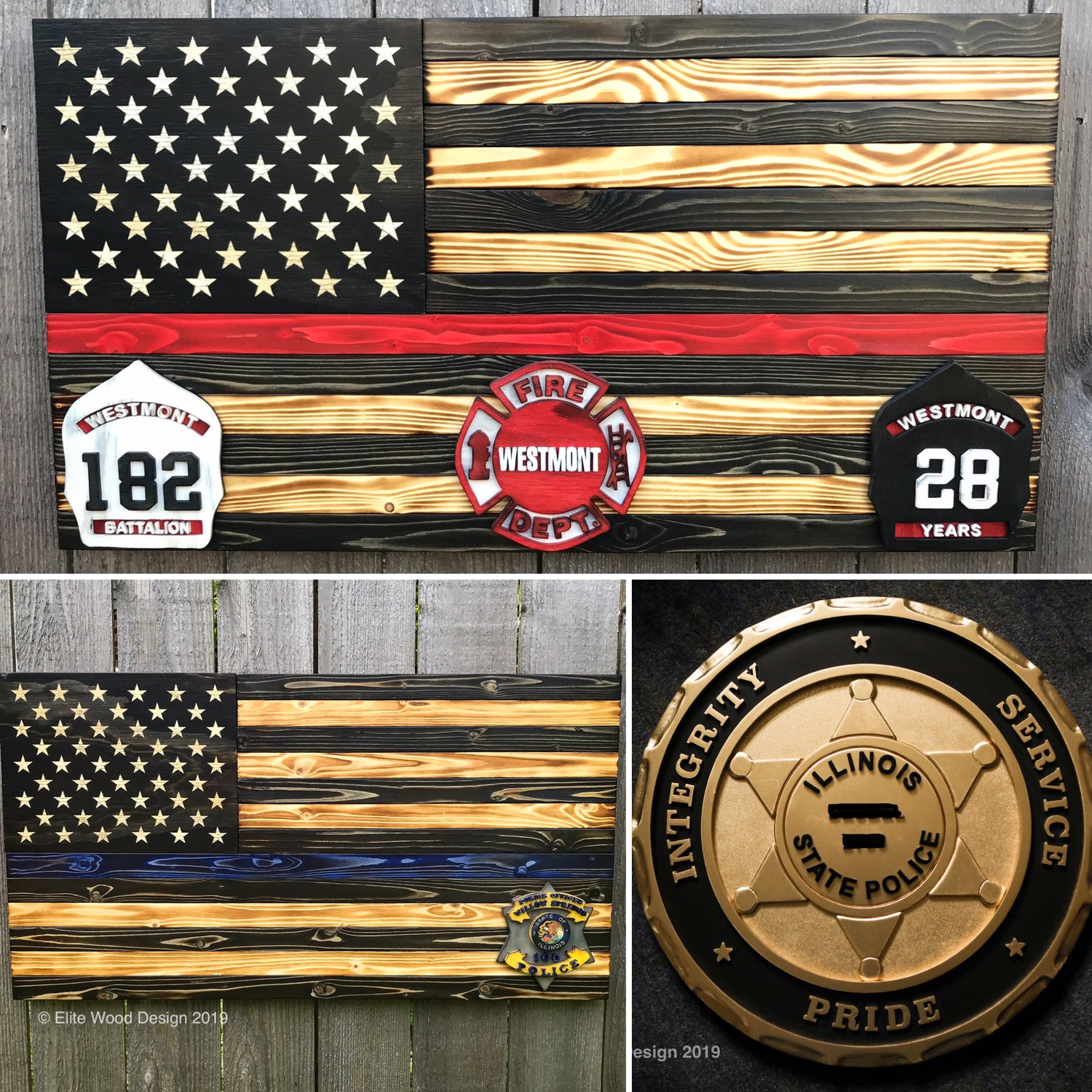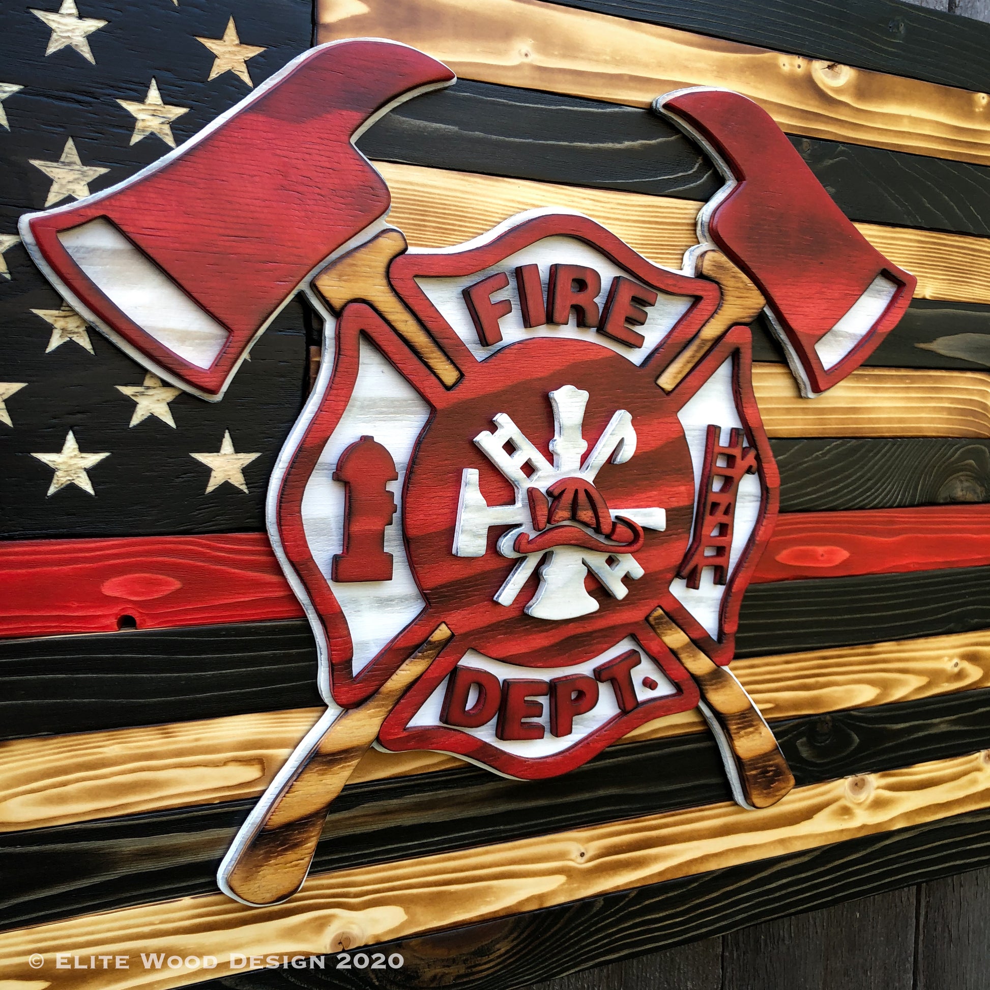 Thin Red Line Firefighter Wood Flag with generic fire dept. maltese with crossing axes. The Thin Red Line is a symbol used by fire departments to honor their fellow brother and sister firefighters; present, injured, and the ones who paid the ultimate sacrifice in order to save and protect life and property.